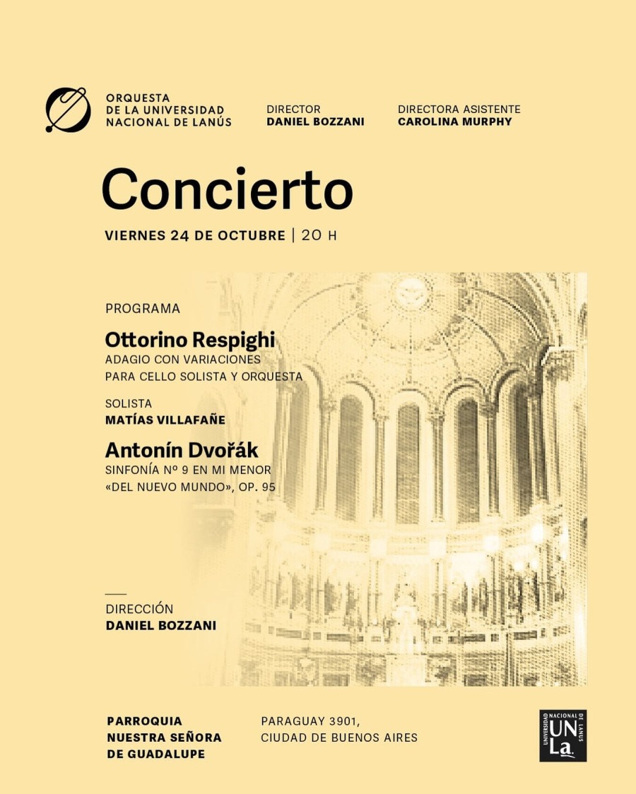 Este viernes 24 de octubre a las 20, la Orquesta de la Universidad Nacional de Lanús brindará un concierto gratuito en la Parroquia Nuestra Señora de Guadalupe, ubicada en Paraguay 3901 Ciudad de Buenos Aires.