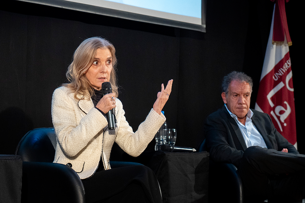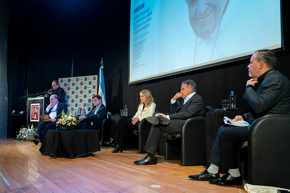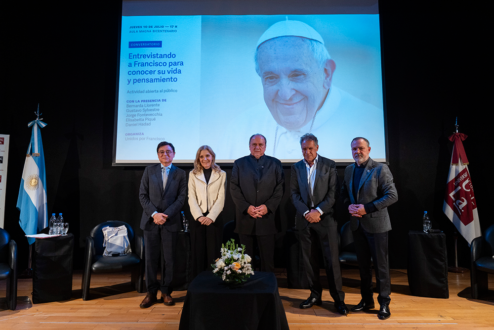 En un Aula Magna colmada de estudiantes, dirigentes sindicales, autoridades eclesiásticas y políticas, nuestra Universidad fue escenario el jueves 10 de julio de una emotiva y profunda reflexión sobre la figura de Jorge Bergoglio. Bajo el título Entrevistando a Francisco para conocer su vida y pensamiento, cinco reconocidos periodistas que tuvieron la oportunidad de entrevistarlo durante su pontificado —Bernarda Llorente, Gustavo Sylvestre, Jorge Fontevecchia, Elisabetta Piqué y Daniel Hadad— compartieron sus experiencias y miradas sobre el Papa argentino.