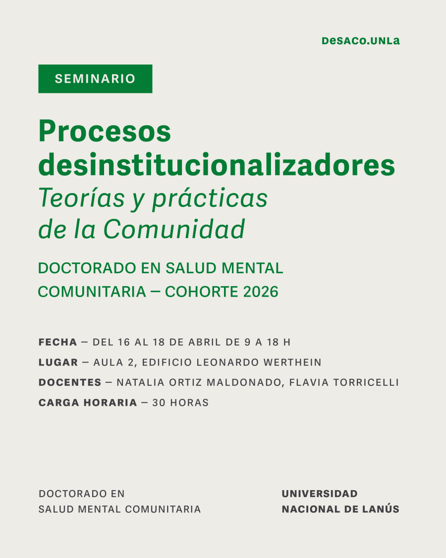 El Doctorado en Salud Mental Comunitaria convoca al seminario Procesos desinstitucionalizadores. Teorías y prácticas de la Comunidad, que se dictará del 16 al 18 de abril de 9 a 18 horas, en el edificio Leonardo Werthein de nuestra universidad.